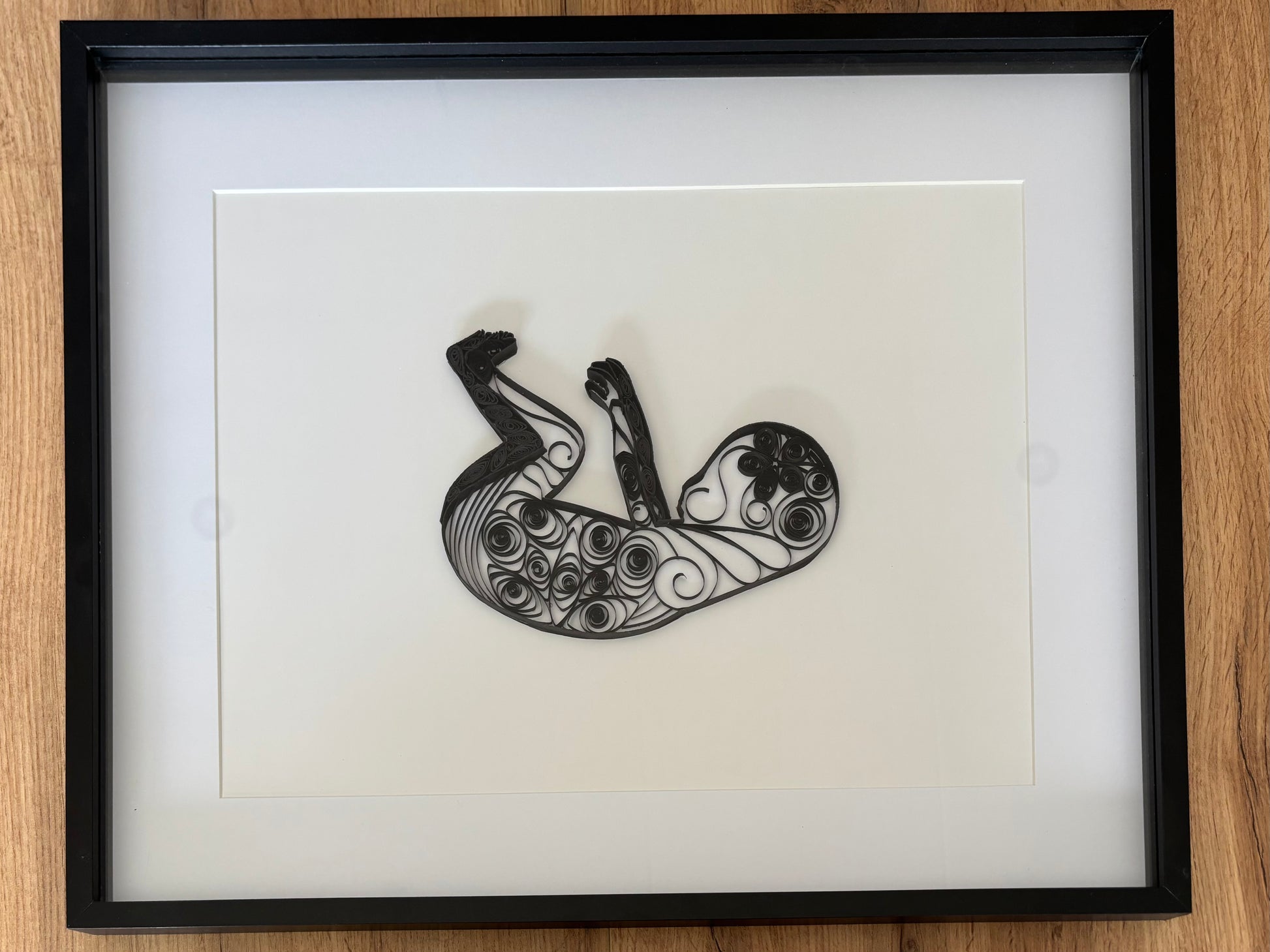 Dit handgemaakte portret is een bijzonder kunstwerk van papier, gemaakt met de verfijnde quilling-techniek. Elk lijntje en elke krul van papier vormt samen een silhouet, een unieke vertaling van de allereerste afbeelding van nieuw leven.