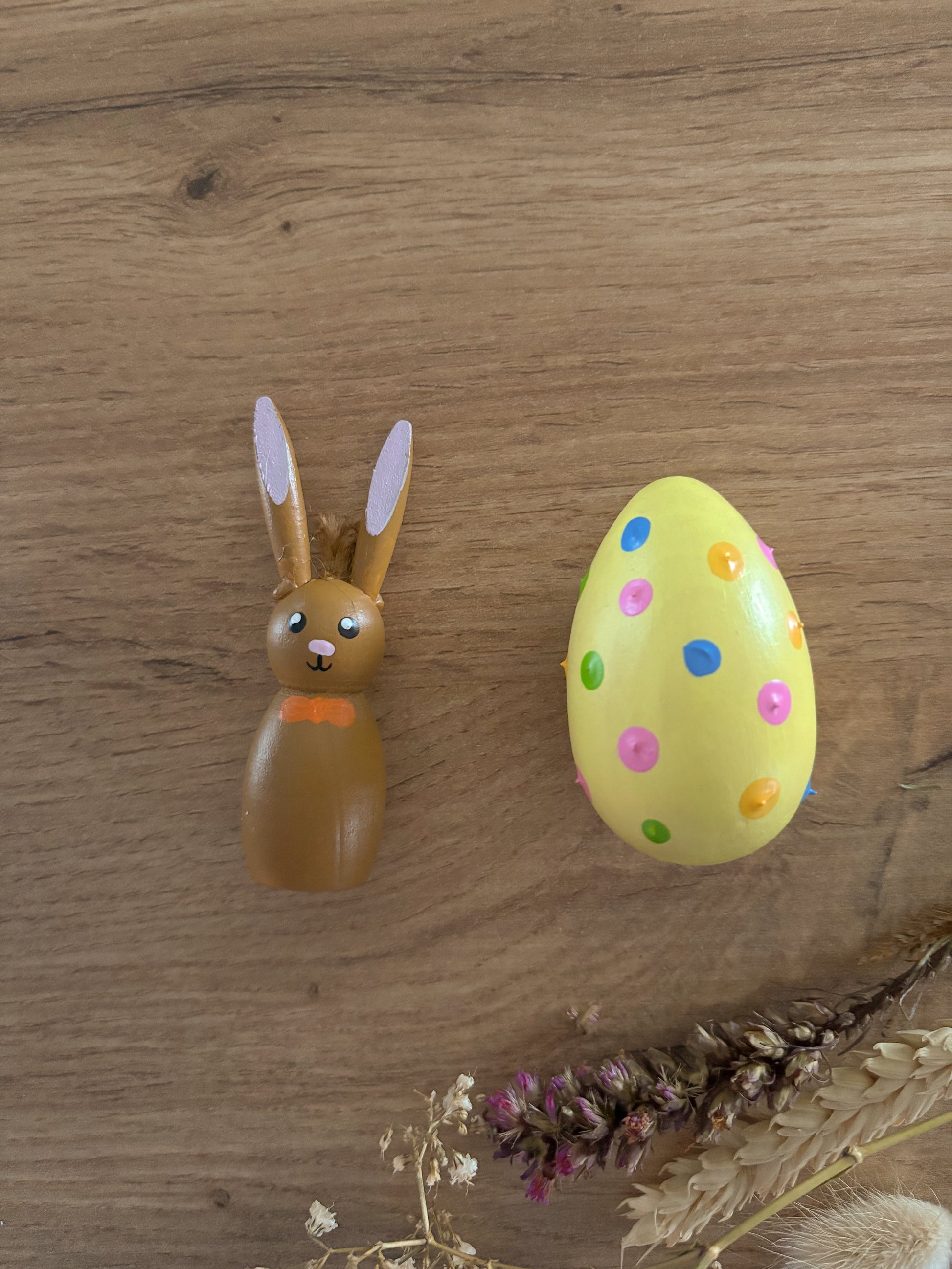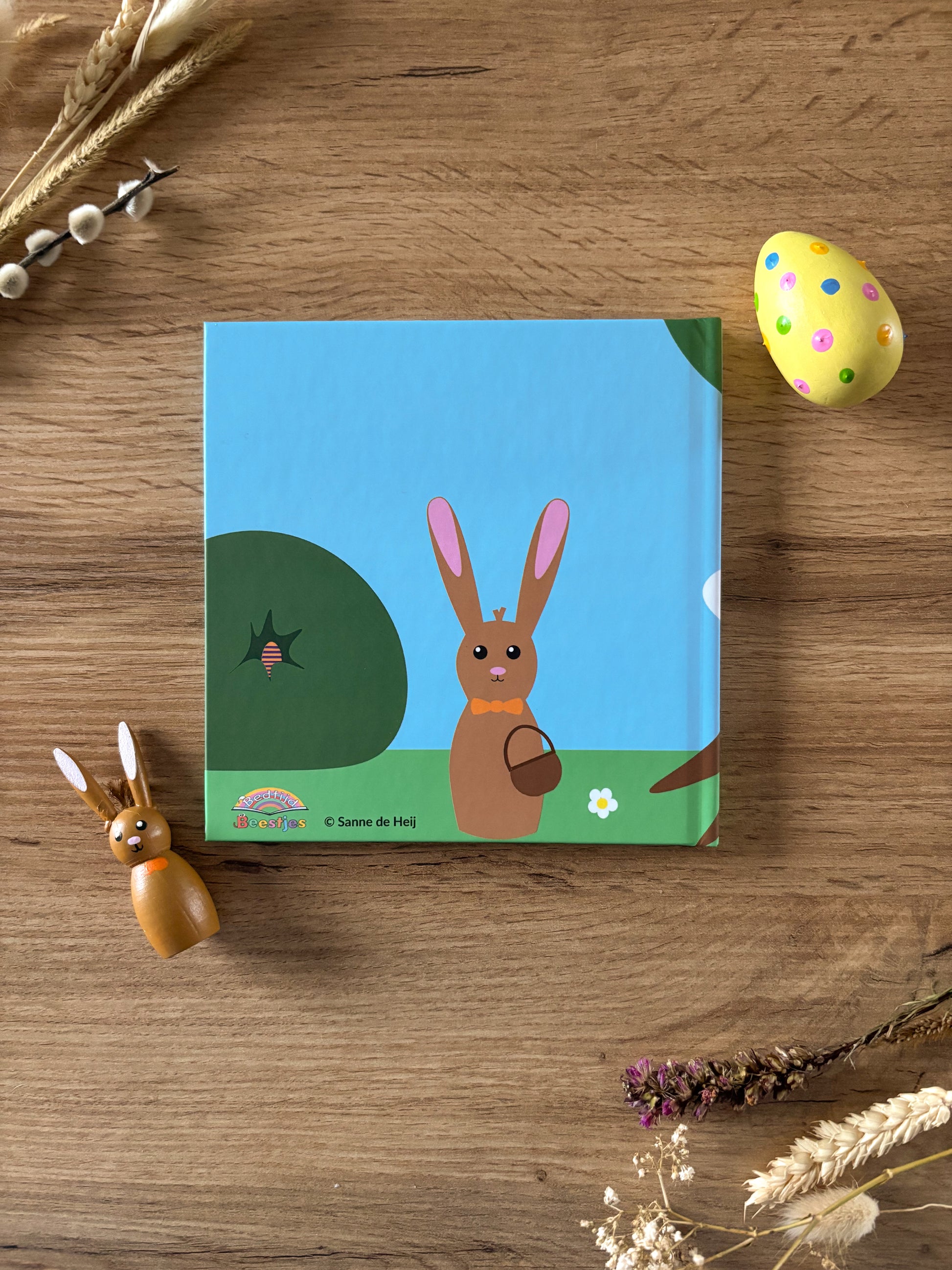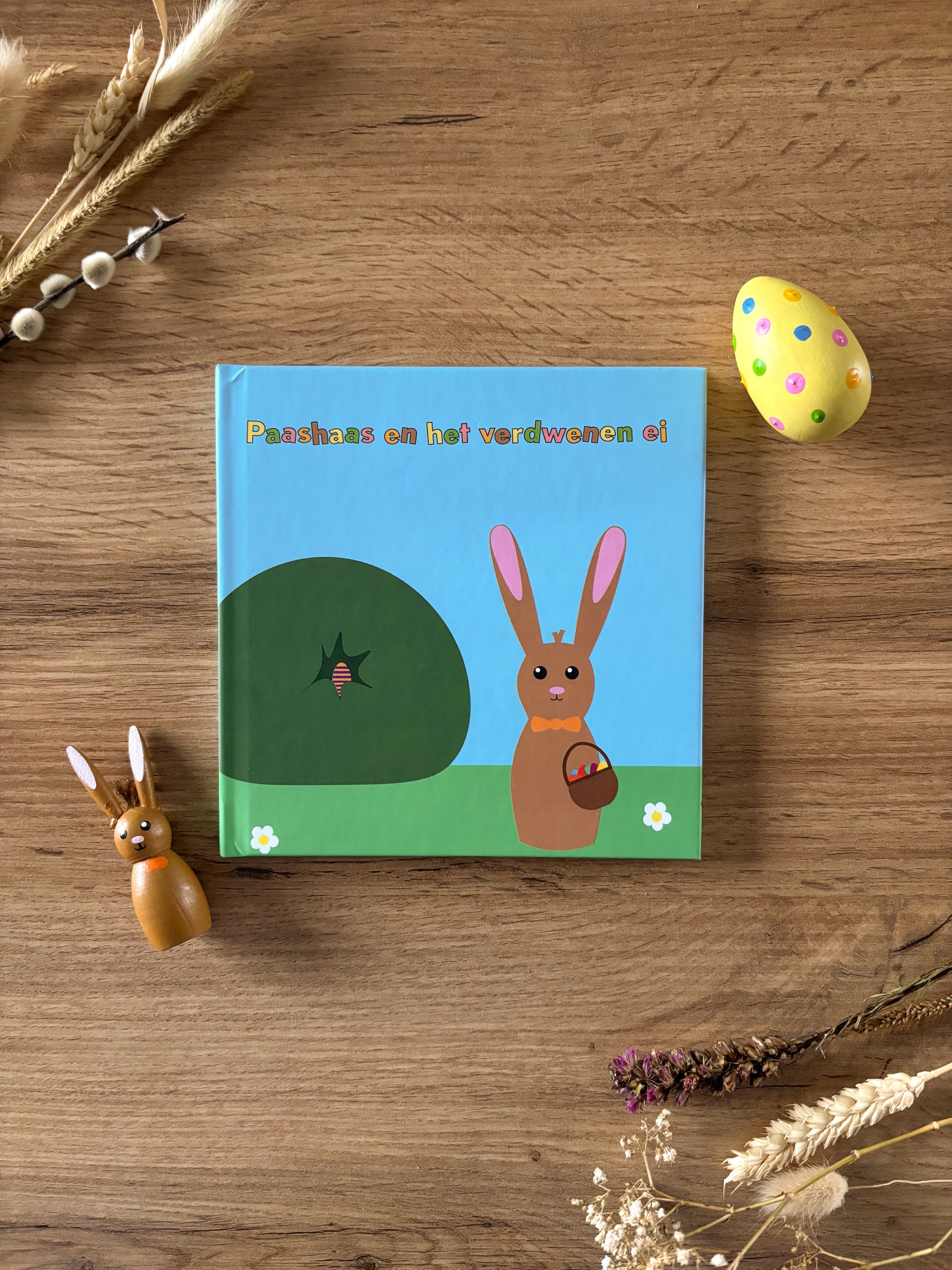 In de verpakking zit een boekje met daarnaast twee houten figuurtjes. Deze houten figuurtjes bestaan uit Paashaas en het ei. Het ei is ter grote van een echt ei en is ook leuk om echt te verstoppen, zodat het kindje en Paashaas samen op zoek kunnen naar het ei.